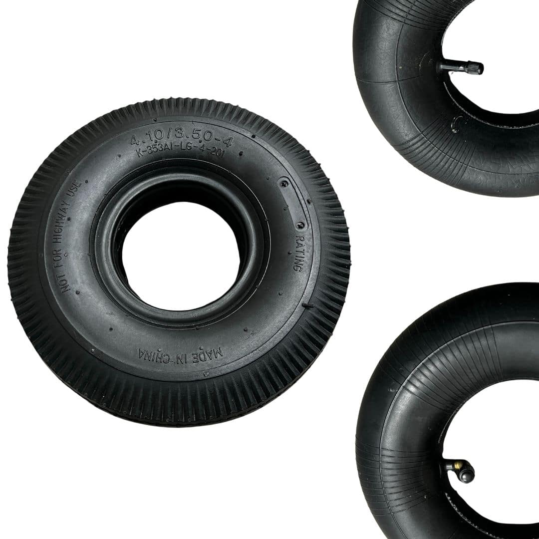 Set 1 binnenband +1 buitenband in de bandenmaat 4.10/3.50-4 (350×10). Je kunt kiezen uit recht of gebogen ventiel. Heb je nu recht en het bevalt goed, dan kan je die nemen. Had je weinig ruimte om op te pompen? Dan is gebogen/haaks ventiel een betere keus. De buitenband heeft een visgraat profiel.